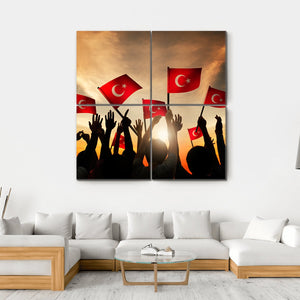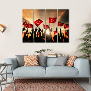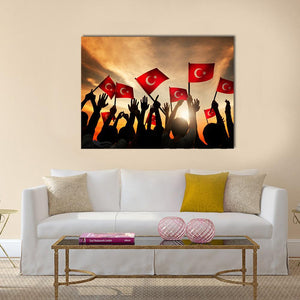 This eye-catching canvas art features a silhouetted crowd holding Turkish flags, set against a vibrant sunset sky. The celebratory and patriotic mood makes it a striking addition to any space.