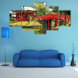 This serene landscape features a red bridge and gazebo nestled beside a tranquil pond, reflecting the surrounding greenery. Capturing the peaceful essence of Japan, it beautifully evokes a sense of calm.