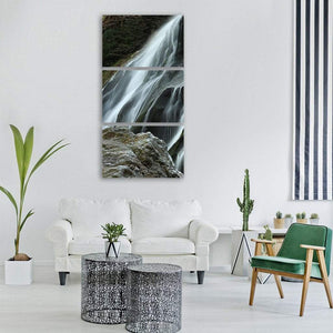 A nature photograph of a waterfall cascading over rocks and framed by green foliage, captured with a long-exposure blur that softens the water. The image feels serene, natural, and majestic — a calm, nature-focused piece for modern or nature-inspired wall decor.