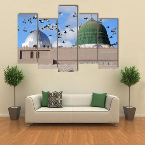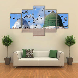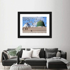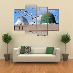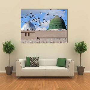 This canvas art features the majestic domes of the Prophet Muhammed Holy Mosque, complemented by a serene flock of pigeons in flight. The realistic depiction captures the beauty of the mosque's detailed stone facade, creating a peaceful atmosphere that enhances any space.