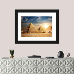 This canvas artwork captures the serene beauty of the Egyptian pyramids bathed in the warm hues of a sunset. With its dramatic composition and photorealistic details, it invites a sense of awe and tranquility into any space.