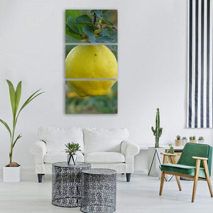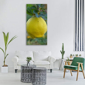 A close-up botanical study of a single ripe yellow quince resting on a tree branch with green leaves. The realistic, natural composition reads fresh and serene, with a warm yellow, green and brown palette. Works well in kitchen or dining spaces and other nature-inspired rooms.