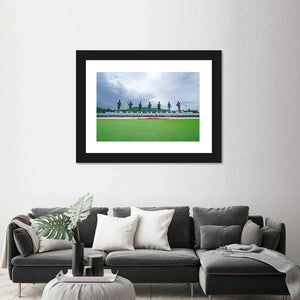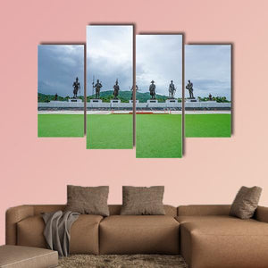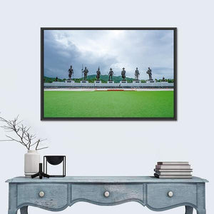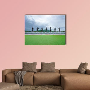 This canvas depicts seven king statues lined across a lawn beneath a stormy, overcast sky, giving the scene a historic, monumental feel. Rendered in a realistic landscape style with muted greens, greys, whites and browns, it suits home living spaces seeking a quiet, contemplative focal piece.