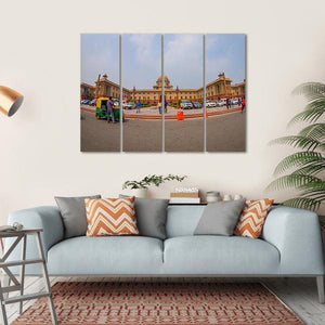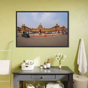 This canvas artwork captures the bustling scene around Rashtrapati Bhavan, showcasing a stunning government building with a central dome. The vibrant palette features tan, beige, and green hues, bringing to life the dynamic street filled with autorickshaws, cars, and people.
