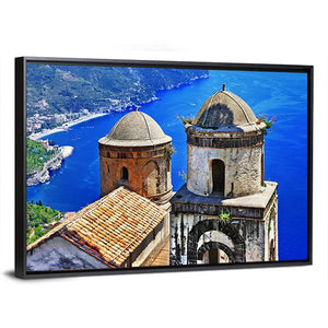 A photographic canvas of Ravello on the Amalfi Coast that shows church towers, tiled roofs and the sunlit coastline. The scene feels serene and picturesque, with blue sea, brown roofs, white highlights and touches of green. It fits well in coastal or Mediterranean-style rooms and modern interiors seeking a calm, vibrant landscape print.