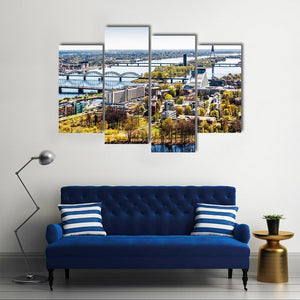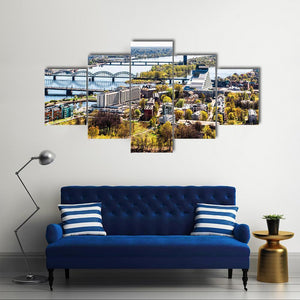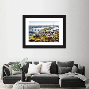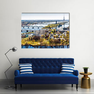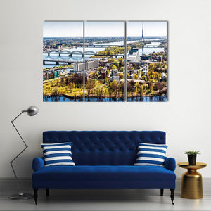 This canvas captures a serene cityscape of Riga, showcasing its elegant bridges and tall towers. The bright palette of blues, greens, and autumnal yellows brings a calming atmosphere to any wall.