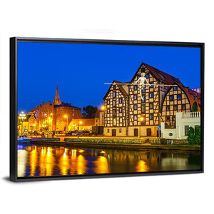 A realistic night cityscape of River Brda in Poland, featuring timber-framed riverfront buildings, a church steeple, a boat, and lights reflected on the water. The scene mixes a peaceful and lively urban mood with a blue-and-golden palette, making it a natural fit for modern living spaces and room decor.