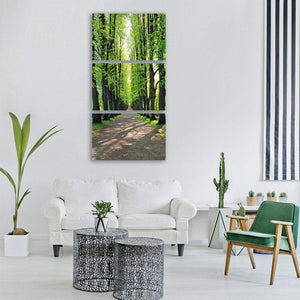 A tree-lined path through a summer forest, with sunlight dappling the leaves and soft shadows along the trail. The scene feels serene and inviting, rendered in natural greens, browns, and whites—suitable for modern living rooms, hallways, or nature-focused décor.