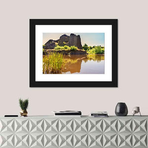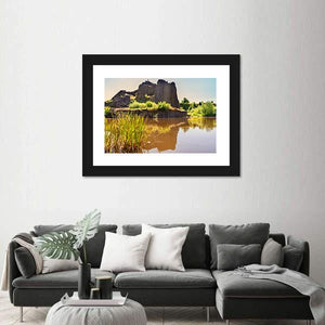 This canvas art captures serene basalt columns reflected in a tranquil lake, surrounded by lush reeds and trees. With a soothing palette of browns, greens, blues, and grays, it's a perfect addition for nature lovers seeking calm and elegance in their space.