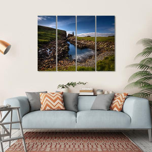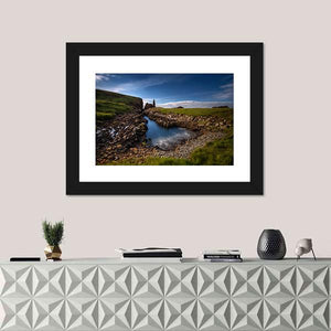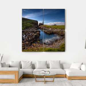 This canvas art captures a serene coastal inlet along Scotland's rugged shoreline. Featuring a dramatic blue sky and a textured rocky landscape, it's a tranquil addition to your wall decor.