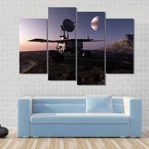 This piece features a space rover exploring a distant moon, set against a serene cosmic backdrop. The eye-level perspective captures the beauty of a banded planet in the sky and a sandy terrain, creating an exploratory atmosphere.