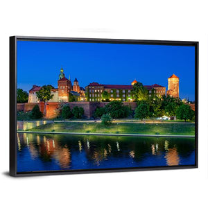 Wawel Castle glows above the Vistula River in this realistic landscape print, with the illuminated castle and its reflection captured at dusk. The scene feels serene and evening‑calm, with blues and warm oranges balancing tree-lined riverbanks. It suits a living room or study that favors architectural and nature imagery.