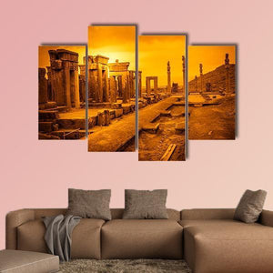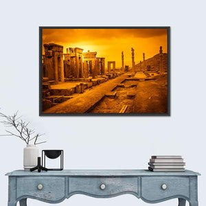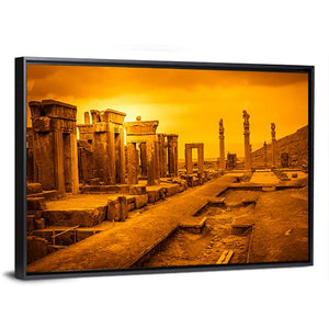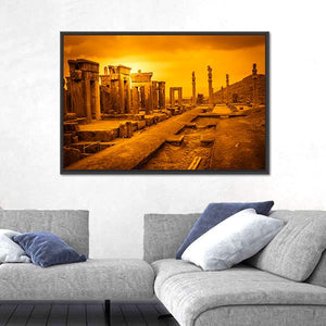 Persepolis, Iran appears in this wide-angle canvas study of ancient ruins and weathered stone columns, rendered in warm orange, gold, and brown. Sepia tone and an overcast sky give the scene a dramatic, vintage feel; it suits a living room, study, or travel-focused room in the home.