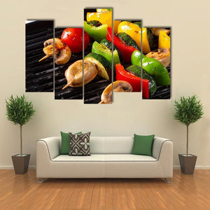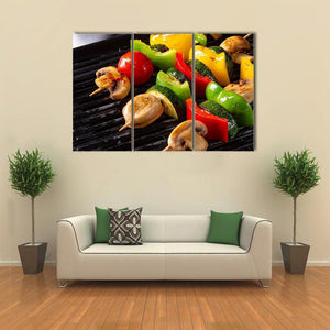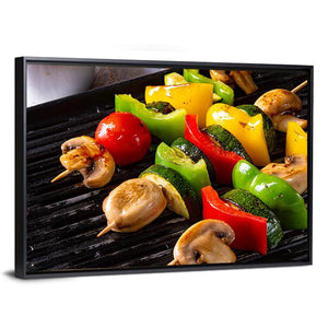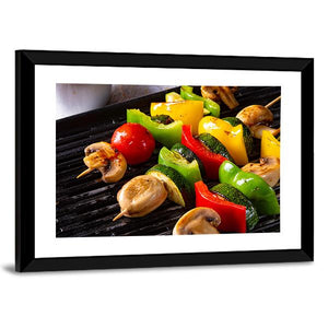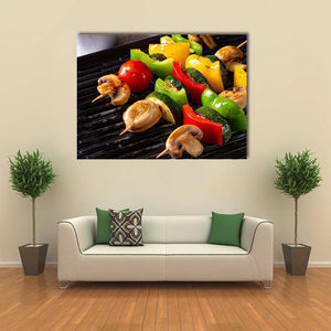 A close-up, top-down image of rustic vegetable shashlik—mushrooms, peppers and tomatoes threaded on skewers with grill marks on a black grill. The realistic, colorful photo feels appetizing, healthy and vibrant, with green, red, yellow and brown tones. Suited to kitchens, dining rooms or restaurant walls as lively food-focused decor.