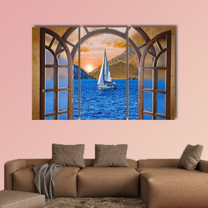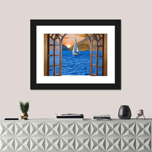 A sailboat with white sails drifts on a calm lake, seen through an arched window with the sun setting behind distant mountains. The realistic, scenic piece uses blue, orange, green and brown tones to create a warm, tranquil mood. Works well in living rooms or bedrooms and blends with modern or nature-inspired decor.
