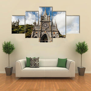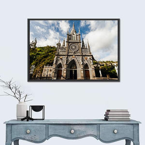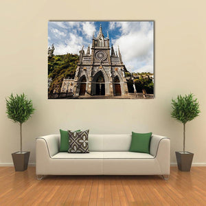 This canvas print features the grand Sanctuary Of Our Lady Las Lajas, capturing its majestic architectural beauty against a lush mountainside. With a photorealistic style, it brings a sense of historical significance that complements any space.