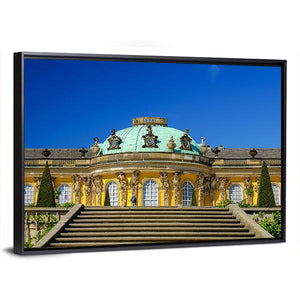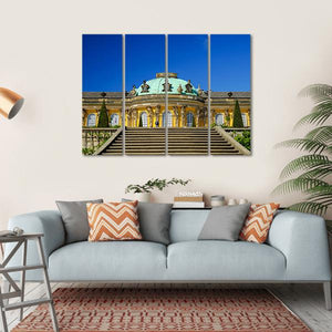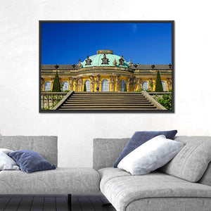 Bring the grandeur of Sans-Souci Palace in Germany into your home with this beautiful canvas wall art. Featuring a symmetrical composition of ornate architecture, lush topiary trees, and a vibrant blue sky, this piece evokes a stately and clear atmosphere.