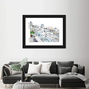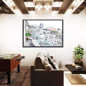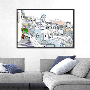 This canvas art captures the serene charm of a Santorini village, emphasizing architectural details and lush plant life. Its bright palette of white, blue, and brown adds a refreshing touch to your space.
