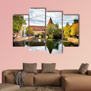 This landscape canvas shows the Hallergate bridge spanning the Pegnitz River with a nearby building, tower, and tree-lined banks reflected in calm water. Autumn foliage and a cloudy sky give the image a serene, picturesque mood. It suits living rooms, studies, or hallways with modern, nature-inspired decor.