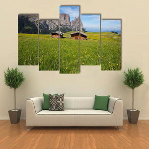 Sciliar Mountain Massif With Santner Peak presents a wide-angle view of a mountain range and alpine meadow, complete with two wooden huts and rocky peaks. The green, brown, blue, and gray palette creates a serene, peaceful mood that fits well in rustic or nature-inspired rooms and modern living spaces.
