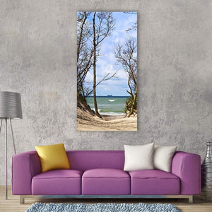 Serene and natural, this realistic beach and ocean scene shows a sandy path leading to the water, bare trees framing the view, and a distant ship on the horizon. The calm palette of blues, greens, tans, and browns reinforces the tranquil mood. It suits coastal or nature-inspired rooms and modern living spaces.