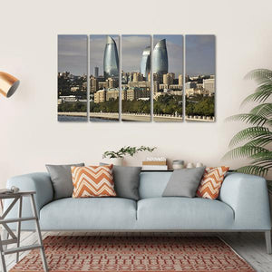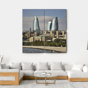 Capture the vibrant cityscape of Baku with this canvas art featuring iconic flame-shaped buildings and a serene waterfront. The bright blues and greens evoke a lively daytime atmosphere, perfect for enhancing modern decor.