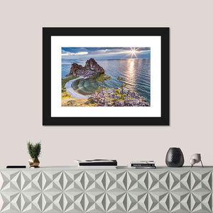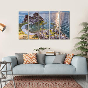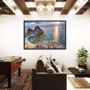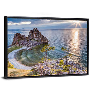 This canvas art captures the breathtaking serenity of Shaman Rock and Lake Baikal, showcasing majestic rock formations, lush trees, and gentle sunlight. The calming palette of blues, greens, and browns evokes a peaceful atmosphere, making it a great addition to any nature lover's space.