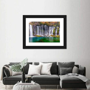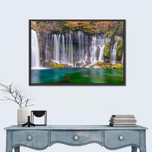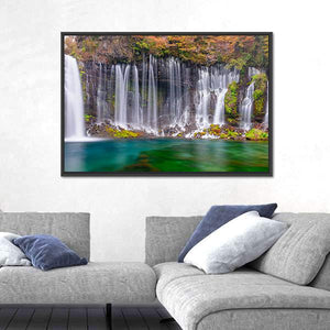 Shiraito Waterfalls Canvas Wall Art presents a quiet landscape of cascading water through lush forest with a river. A green-and-blue palette with touches of brown, white and orange creates a serene, refreshing mood; motion blur on the falls adds depth and movement. This nature-focused print suits modern canvas art collections and room decor in homes that favor a calm, natural look.