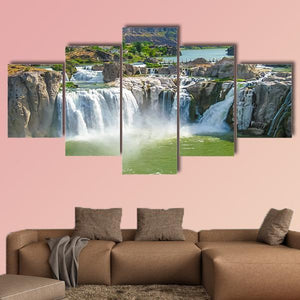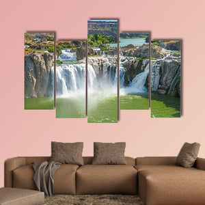 Shoshone Falls Canvas Wall Art depicts a realistic, wide-angle view of a waterfall and river flowing through a canyon. Layered cliffs, lush green vegetation and soft mist create a serene yet powerful natural scene. The nature-focused palette and realistic style suit modern houses and room decor.