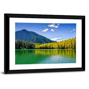 Siberia Lake With Reflection presents a lakeside scene with mountains, forest and trees, puffy clouds, and clear reflections on the water. The blue, green and brown palette keeps the mood serene yet vibrant and suits modern or nature-themed interiors.