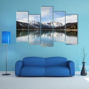 Sierra Nevada Mountains With Lake depicts snow-capped peaks mirrored in a calm lake, framed by trees beneath a pale winter sky. The realistic, tranquil scene and cool blue, white, green, and grey palette suit modern living rooms or bedrooms that favor nature-focused décor.