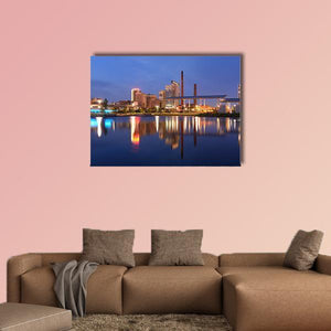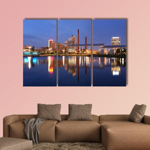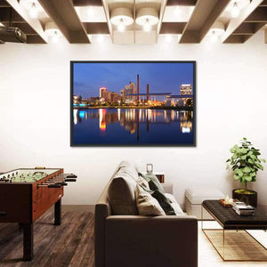 Skyline Of Birmingham Alabama From Railroad Park shows the Birmingham city skyline at dusk, with illuminated buildings, a bridge and soft reflections on the water. The realistic cityscape uses blue, orange, white and gray tones to create a calm, serene, illuminated mood. It fits modern homes and offices and complements contemporary interiors.