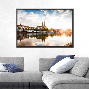 A realistic canvas print of Regensburg's skyline at sunset, showing the town and cathedral with its twin spires mirrored in the calm river. Soft blues, white highlights, warm browns and golds create a peaceful golden-hour mood that suits home and modern interiors.