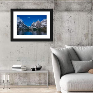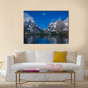 Snow-capped mountains and their clear reflection in a calm lake create a serene, majestic scene. This photorealistic canvas shows blue sky, drifting clouds, pine trees and light snow on the peaks. It fits modern home decor and works well in living rooms or bedrooms.
