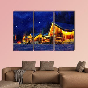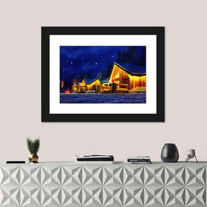 A snowy winter scene with a distant log cabin beneath a dark, starry night sky. Warm lights glowing in the cabin windows and a blue, golden and white palette give the image a cozy, peaceful feel. Works well in rustic or modern nature-themed rooms as a calm landscape focal point.