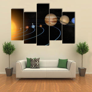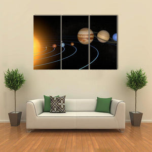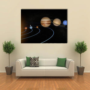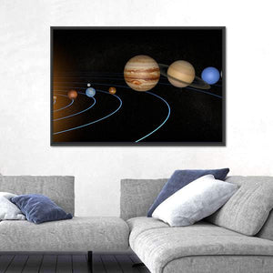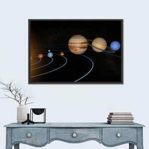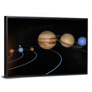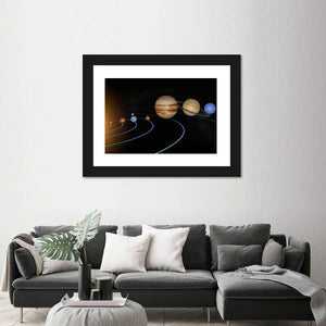 A digital canvas that depicts the solar system with multiple planets, orbital paths, and scattered stars in a black, blue, brown, white, and orange palette. The composition uses depth, rule-of-thirds, and negative space to convey a cosmic, scientific, educational mood. Suited to modern home decor and room settings with an astronomy theme.