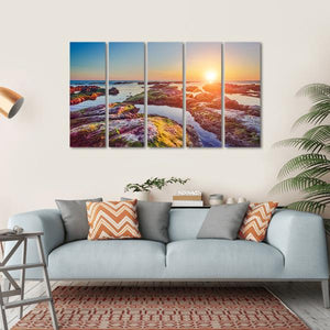 Capture the serene beauty of Sicily's rocky coastline at sunset with this vibrant canvas wall art. The calm waters reflect the stunning colors of the sky, creating a tranquil atmosphere for any space.