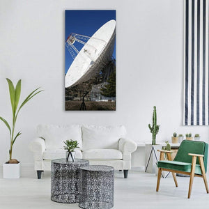 This canvas shows a radio telescope — a satellite dish communications array captured at a dramatic diagonal angle against a clear blue sky. Its white, blue, and grey palette and modern, technical feel suit contemporary living spaces or science-themed rooms.