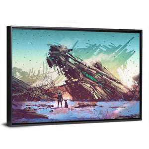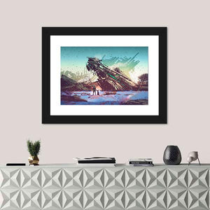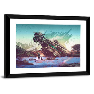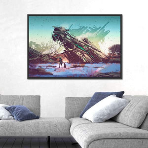 This captivating canvas art features two figures amidst an alien landscape filled with wreckage. With a color palette of blue, purple, and green accented by glowing details, it evokes a mysterious and desolate atmosphere, perfect for sparking conversation.