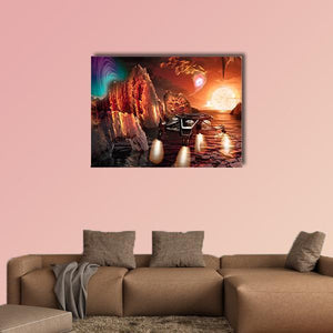 This canvas art captures a dynamic alien landscape with a spaceship at its center, evoking a mysterious and otherworldly atmosphere. Glowing engines and a stunning aurora add to the epic scene, making it a compelling choice for your wall decor.