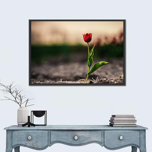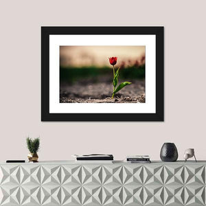 A close-up, photorealistic view of a red tulip rising from soil with dew drops on the petal. The minimalist composition and palette of red, green, brown, and beige create a hopeful, delicate, emergent mood that suits modern room decor.