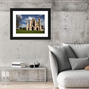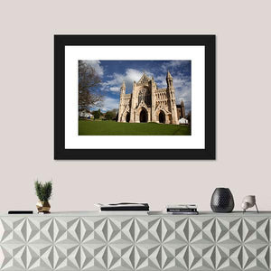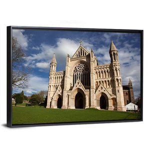 This canvas art features the majestic St Albans Cathedral, capturing its ornate facade and stunning spires against a serene blue sky. The photorealistic design highlights fine architectural details and lush green lawns, making it a beautiful addition to any room.