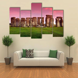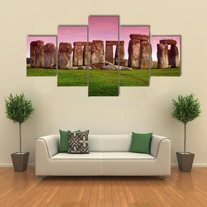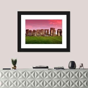 This canvas art captures the tranquil beauty of Stonehenge against a vibrant pink and purple sunset. The large standing stones are surrounded by lush green grass, evoking a serene and majestic atmosphere.