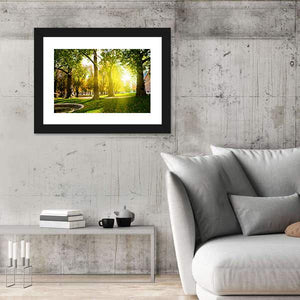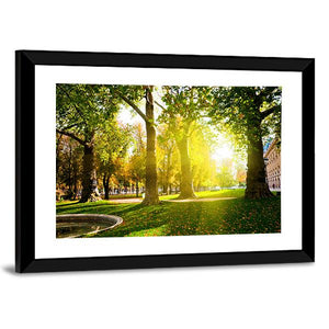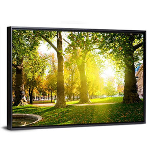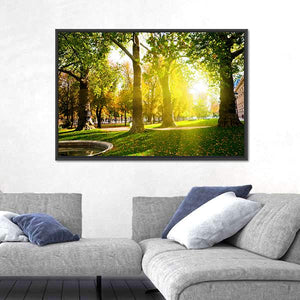 This naturalistic canvas depicts a park scene with trees, a circular pond edge and sunbeams filtering through the branches. Rendered in greens, yellow, brown and hints of blue, the composition uses depth and the rule of thirds to create a peaceful, warm, autumnal atmosphere that suits modern or nature‑inspired rooms like living rooms or studies.