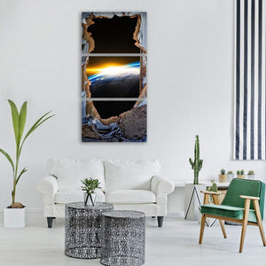 This piece depicts Earth from space with the sun rising through a torn opening, rendered in black, blue, orange, white, and brown for a realistic atmospheric effect. The surreal, awe-inspiring scene includes a ripped texture around the opening and works well with modern or space-themed decor.