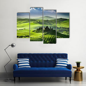 This canvas wall art captures the serene beauty of rolling green hills and vineyards under a bright sunrise. The idyllic landscape, with sunbeams breaking through clouds, creates a peaceful atmosphere, perfect for bringing a touch of nature indoors.