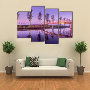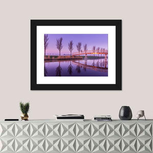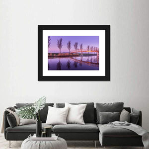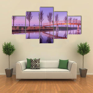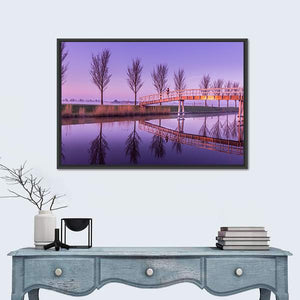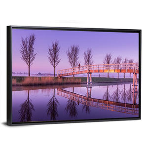 Sunrise On A Canal Bridge In Holland shows a quiet bridge, trees and their reflection in calm water, with a single person visible on the bridge. The purple, green and brown palette and symmetrical composition create a calm, serene twilight mood with a modern, minimalist feel. The print fits well in modern or minimalist living spaces and brings a peaceful focal point to a bedroom or living room.