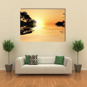 Sunrise Over Lake Canvas Wall Art shows a calm lakeside sunrise with silhouetted trees, birds, and a clear reflection on the water. The warm orange and yellow palette and rule-of-thirds composition create a serene, tranquil feel that suits modern or nature-inspired rooms.