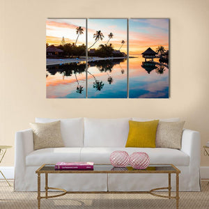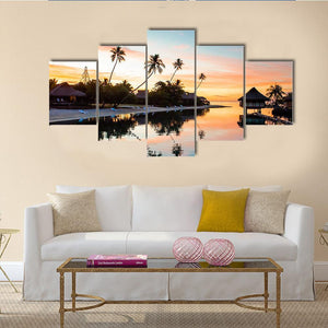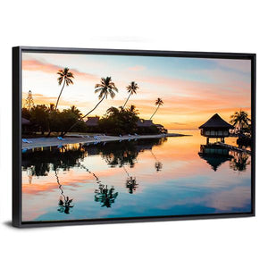 This canvas art captures a serene tropical sunset over Moorea, featuring overwater bungalows and palm trees. The tranquil palette of oranges, pinks, and blues reflects beautifully in calm waters, creating a dreamy atmosphere.