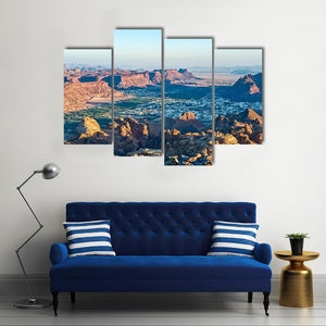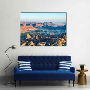 This canvas art captures a vast desert landscape at sunset, featuring sunlit rock formations and a small settlement nestled in a serene valley. With a palette of warm tans and oranges, it brings a tranquil vibe to any space.